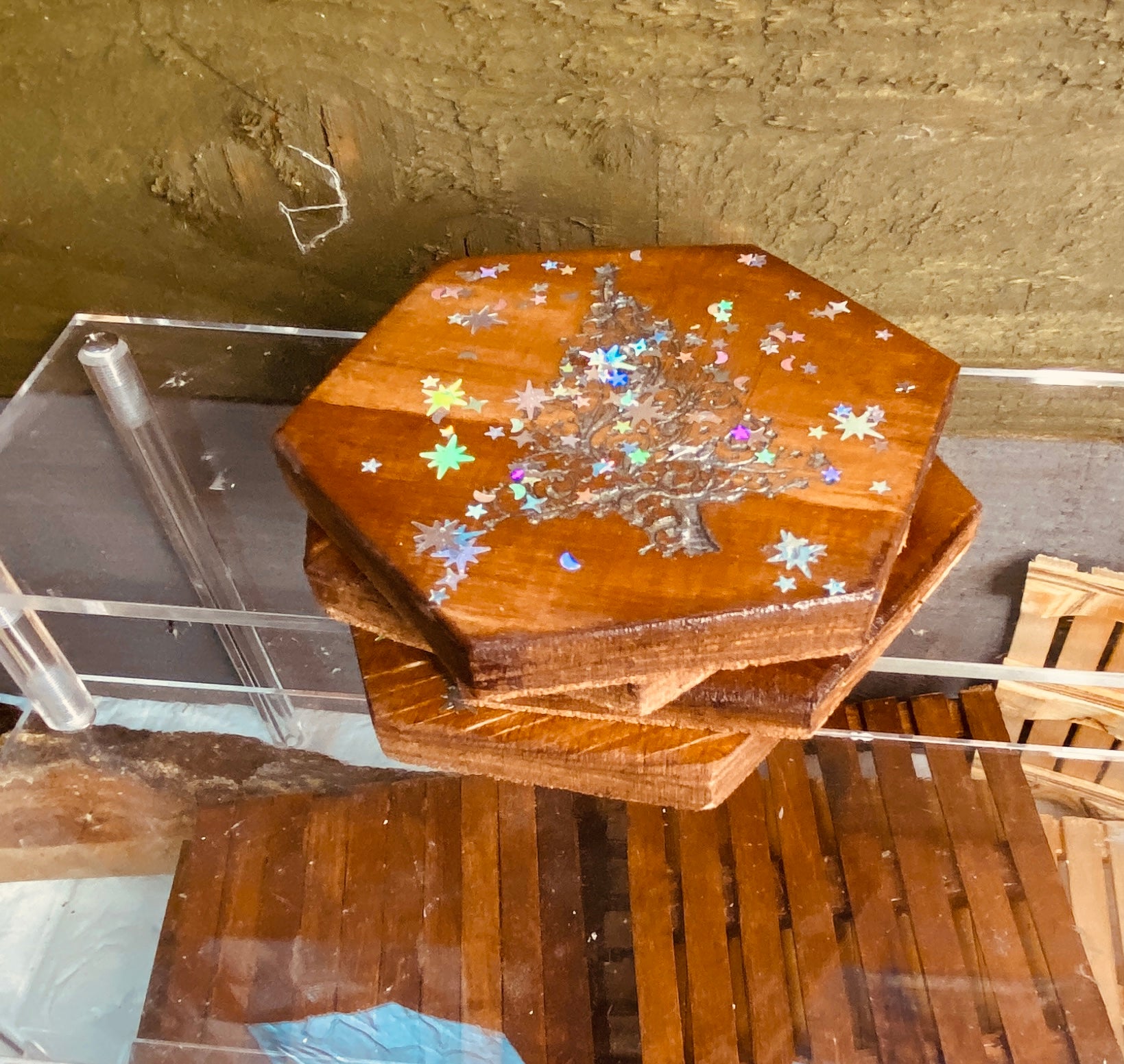 Spruce up your holiday parties with a set of 4 Christmas hexagon coasters! Made from recycled wood, these handmade coasters are laser engraved with a touch of sparkle. A perfect festive gift for any occasion.