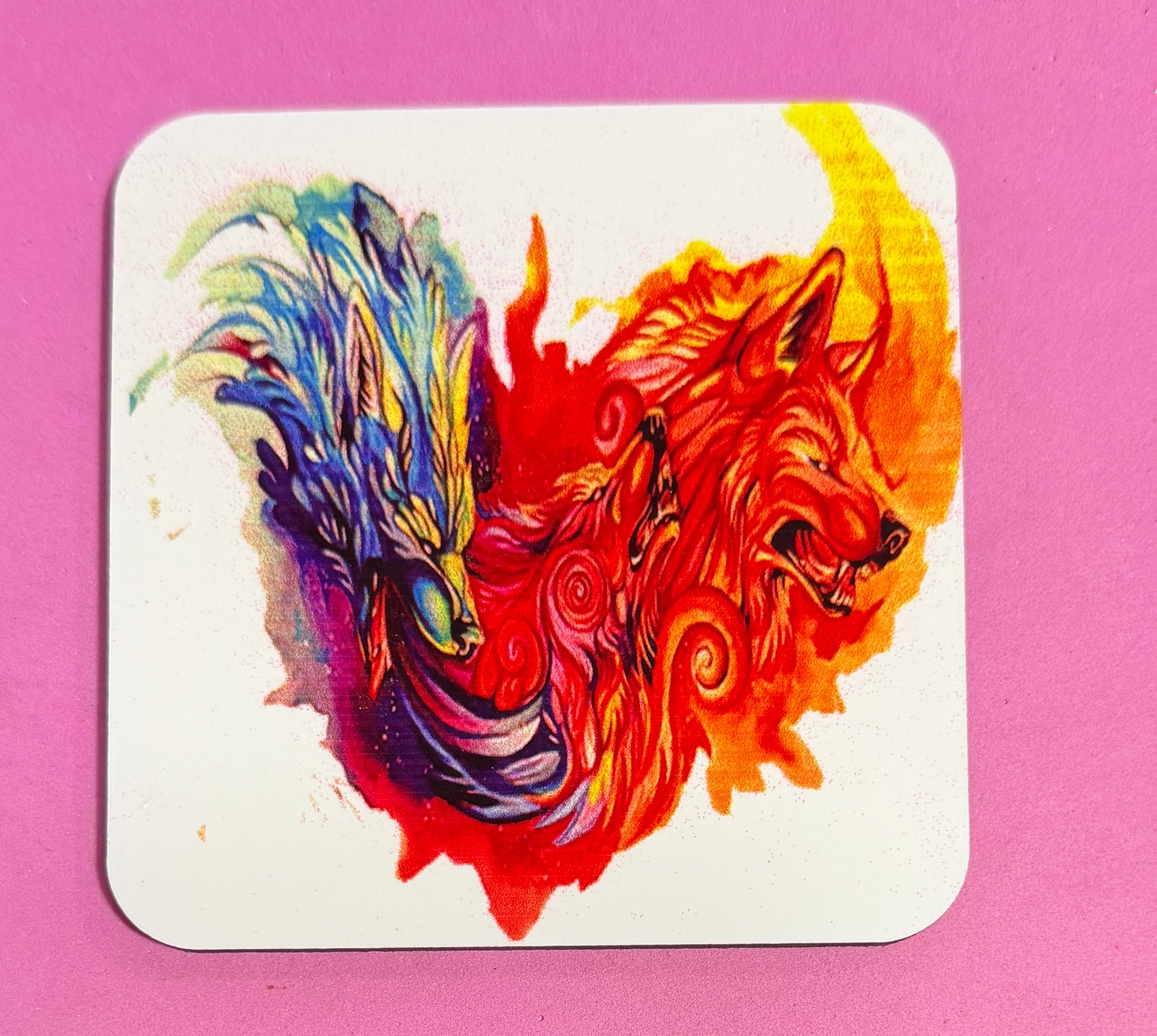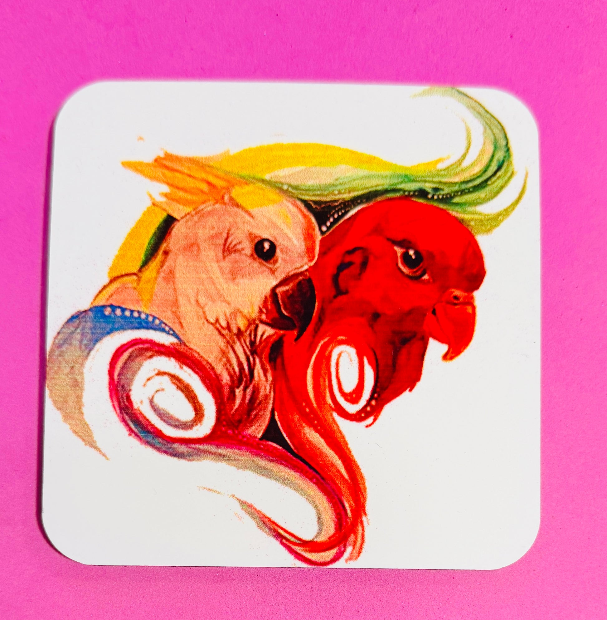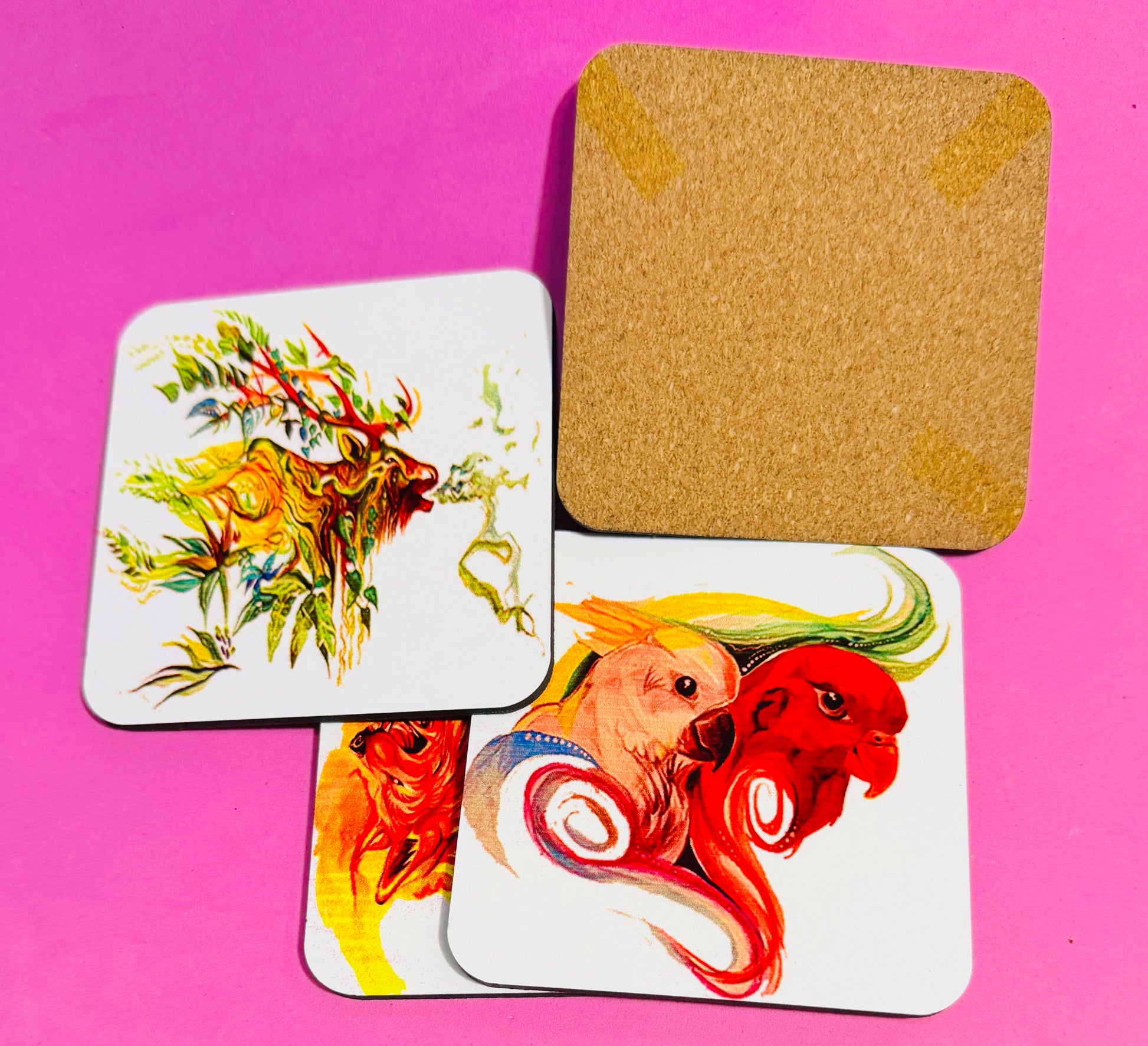 This one-of-a-kind abstract coaster set features striking, expressive artwork inspired by wild birds and a powerful wolf, bursting with colour, movement, and attitude.