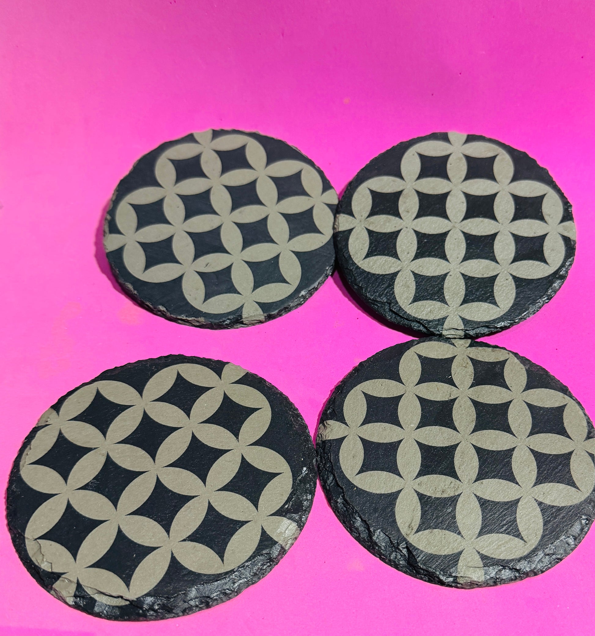 This set of four natural slate coasters features a clean geometric pattern that looks modern, calm, and just a little bit clever — like your home décor got a promotion.