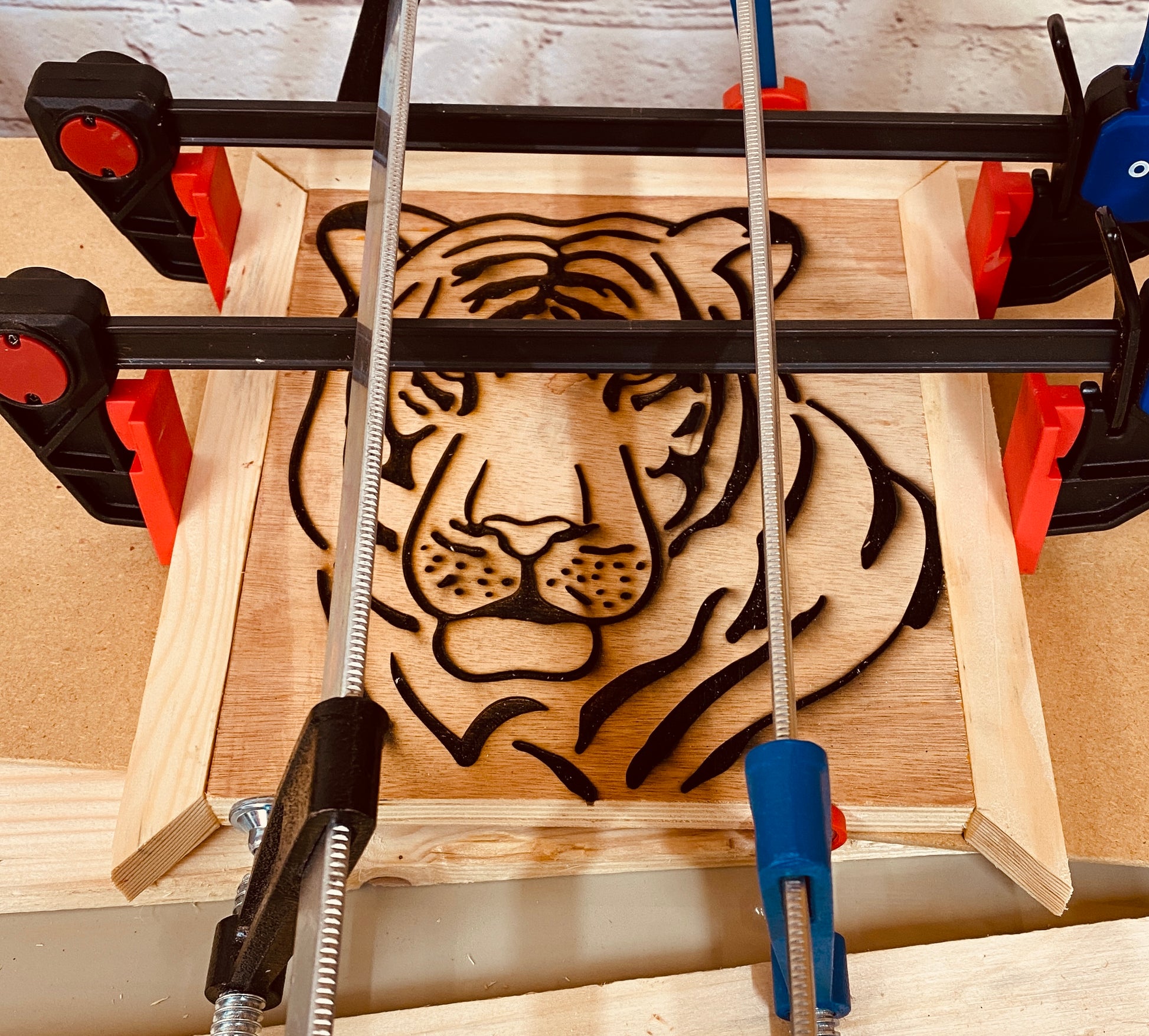 Tiger head laser engraved on plywood